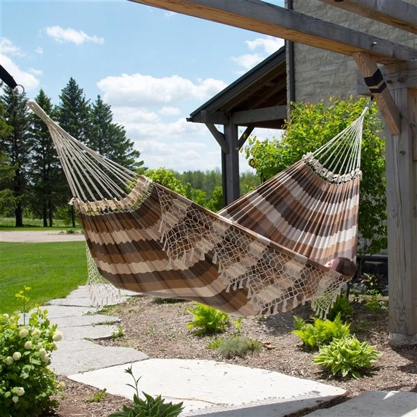 Relax like royalty in this remarkably wide double brazilian ‘Brazilwood’ cotton hammock. Woven with breathable and airy 100% authentic brazilian cotton and crafted with intricate hand-crocheted fringe, this hammock exudes luxury. Enjoy a siesta with a friend in this ultra large hammock, or claim all that space for yourself – easily supports two adults up to a 450 lb capacity.