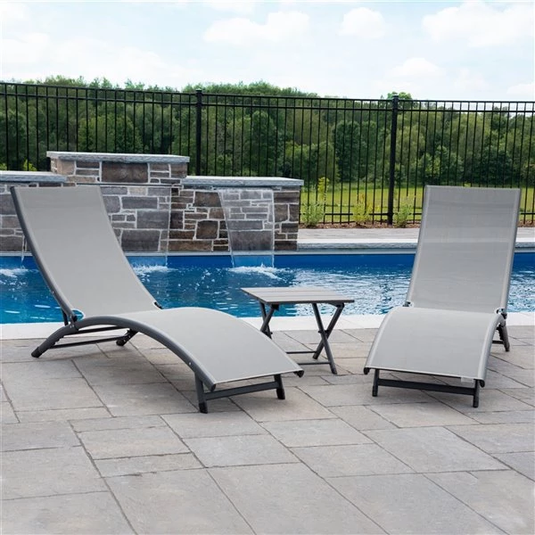 Set of 2 grey and black reclining lounge chairs with 1 side table, perfectly designed for outdoor living.