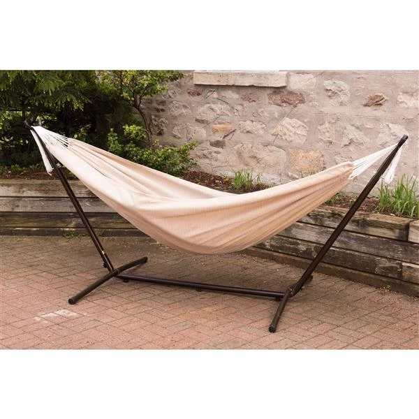 The Sunbrella® Hammock combo is our top choice to challenge the elements. The double hammock is made with Sunbrella® fabric to outlast every season, year after year. It is as comfortable as cotton, creating the perfect refuge for an afternoon snuggle. The stand is constructed of heavy duty steel and assembles in minutes without any tools. Plastic caps top the ends of the steel tubing to create a soft finish. The stand provides you the freedom to setup your hammock in the most convenient location and no longer rely on those two perfect trees. Capacity 450 lbs